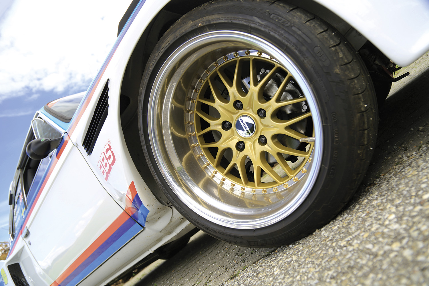 So lieferte die Firma Kerscher aus Falkenberg individuell angefertigte Räder in den Dimensionen 10,5 x 17 Zoll sowie 13,5 x 17 Zoll, bezogen mit Reifen in den Formaten 255/40 R17 und 335/35 R 17. Während diese Räder also um zwei Zoll größer sind als bei Franz‘ anderem E9, herrscht beim Fahrwerk Gleichstand: Franz baute einmal mehr KW-Fahrwerkskomponenten ein. Die Auspuffanlage wurde von Meister Rudolf Brunnmeier umgebaut.
