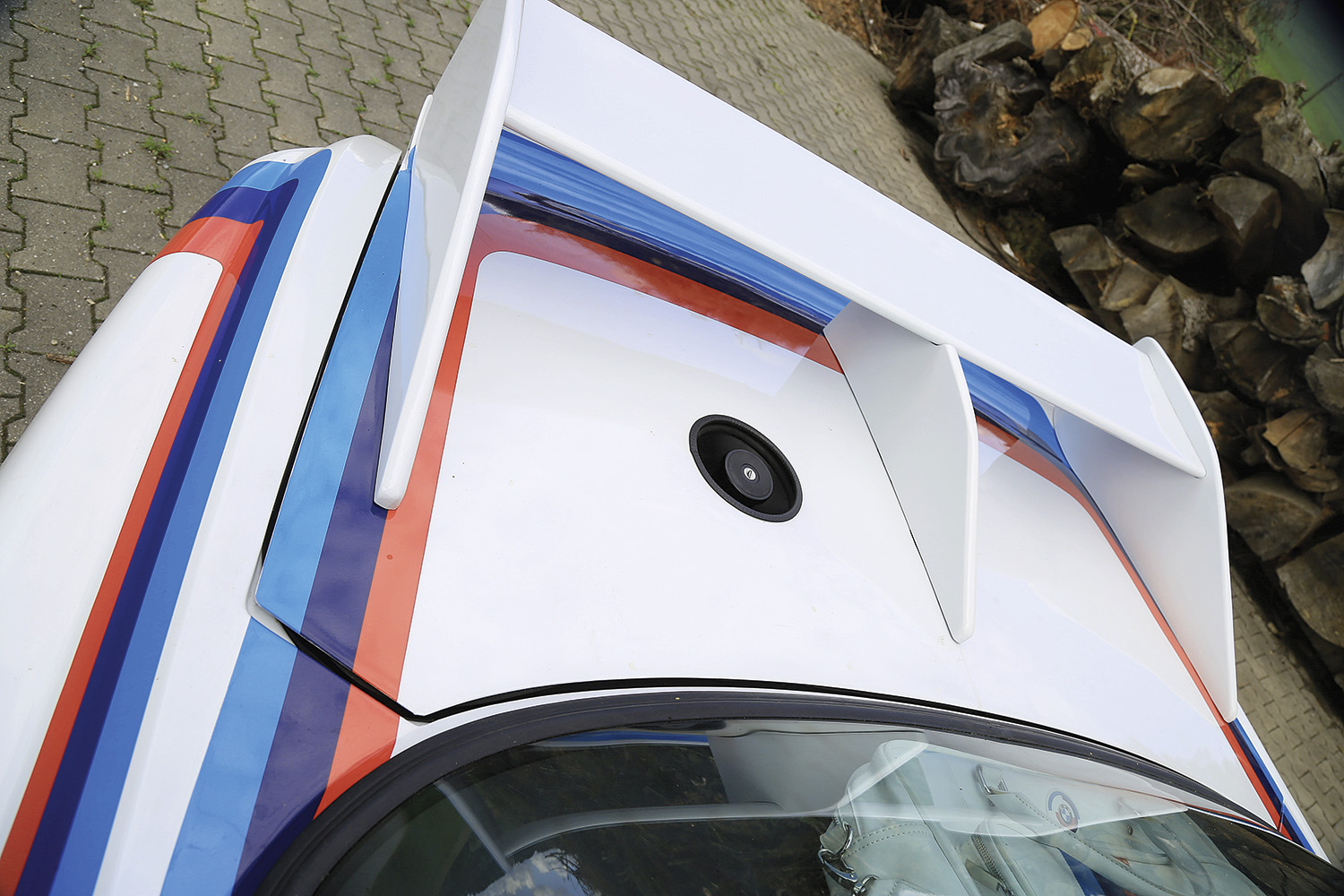 GFK-Gruppe-5-Verbreiterung, hinten mit Luftführungskasten, GFK-Frontspoiler (original wie Rennsport), Dachspoiler aus Kunststoffverbundmaterial, Windsplitter auf den vorderen Kotflügeln, Heckflügel mit drei Halterungen (Sonderanfertigung)