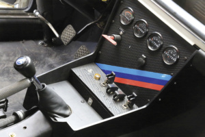 originale E9-Instrumente, Zusatzschalter in Mittelkonsole für elektrische Benzinpumpe, Zusatzlüfter, Not-Aus, Recaro-Sportsitze mit originaler Schiebeverstellung, Stahl-Überrollkäfig, 335er Sonderlenkrad „Indianapolis DTM“, Lackierung in Alpinweiß mit dreifarbiger M-Streifen-Folierung