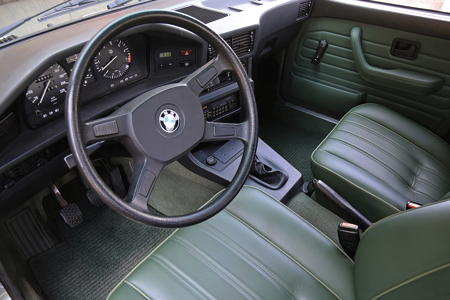 Nach der Leistungssteigerung rückte der Innenraum in den Fokus. Die originale Stoffausstattung war nach mehr als 40 Jahren schlicht verschlissen. 2023 erhielt der 5er deshalb eine komplette Interieur-Kur: Sattlermeister Pawlowski vom „Lederstadl“ in Landsberg am Lech bezog Sitze und Türverkleidungen im Originaldesign neu. Auch ein rissfreies Armaturenbrett konnte organisiert werden, sodass das Interieur wieder wie neu erstrahlt. Die jüngste große Änderung betraf die Räder. Im Frühjahr 2024 bekam der E28 endlich die langersehnten BBS-„RS“-Kreuzspeichen.