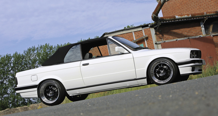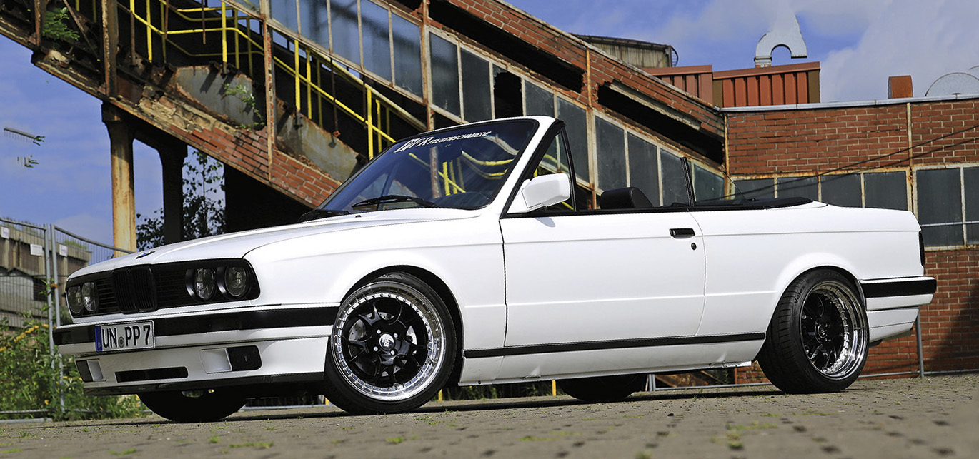 Anfangs stand der E30 auf einem AP-Fahrwerk und RH-„ZW3“-Alus in 8,5 x 17 und 9 x 17 mit 205/40er und 215/35er Gummis. „Das sah nicht schlecht aus, doch wünschten wir ein Gewindefahrwerk. Da wir Vertriebspartner für MTS-Technik sind, war natürlich klar, wo wir uns umsahen – zumal dieser Hersteller als einer der ganz wenigen Anbieter Gewindefahrwerke inklusive Camber Plates fürs E30 Cabrio samt Gutachten liefert. Wir bedanken uns bei Markus Sitowski von MTS-Technik für seine Mega-Unterstützung dabei.“ Nach Montage des Edelstahl-Fahrwerks passten die vorderen RH „ZW3“ nicht mehr. Die Räder stießen an die tiefersitzenden Federn des Gewindefahrwerks und waren so nicht mehr zu drehen. Da sowieso Adaptersysteme zum Einsatz kommen sollten, setzte Paul einfach auf dickere Adapterplatten, um die Räder weiter nach außen bringen. „Dass wir gleich 40-mm-Platten pro Seite verwenden mussten, hat uns jedoch kalt erwischt. Denn da tat sich ein Problem auf – wo bekommt man heute noch 40er RH-Adapterplatten mit der Anbindung 4 x 100 auf 4 x 100?“