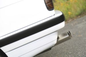 Karosserie: Reinweiß, Motorraum gecleant, Batterie im Kofferraum, Wischwasserbehälter hinter Stoßstange, E30-M3-Kabelabdeckungen an Stirnwand, Domstrebe, Depo-Scheinwerfer und -Nebler, elektrische statt hydraulische Leuchtweitenregulierung, schwarze Blinkergläser und Rückleuchten; Frontlippe, Heckblende, Motorhaubendämpfer, Werkzeug- und Luftfilterkasten, Kühlerhalter, Sicherungskasten-, ABS-Block-, Scheinwerfer- und Kabelabdeckungen in Carbon laminiert; sichtbare Schrauben und Motorhaubenführungen verchromt, Tank weiß pulverbeschichtet