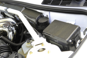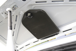 Eine verstellbare Domstrebe, die die Brüder weiß pulverbeschichten ließen, gab den Auftakt für weitere Stilübungen, fährt Paul fort: „Sämtliche sichtbaren Schrauben sowie die Motorhaubenführungen haben wir geschliffen, poliert und verchromen lassen. Da Dimi bereits angefangen hatte, dazu kontrastierend diverse Teile mit Carbon laminieren zu lassen, machten wir auch damit an beispielsweise Frontlippe, Motorhaubendämpfer, Luftfilterkasten, Kühlerhalter sowie Sicherungskasten-, ABS-Block-, Scheinwerfer- und Kabelabdeckungen weiter. An der Stelle möchten wir uns bei Michael Koordt, dem Inhaber von K-Tech in Hagen, herzlichst für seine Mega-Arbeiten bedanken. Der Kerl hat es echt drauf! Als Alternative zu den anvisierten, aber kostspieligen Hella-„Black“-Scheinwerfern empfahl uns Martin-Julian Konieczek, Inhaber der Caldener Firma Lichter-Profi, schwarze Scheinwerfer und Nebler von Depo. Lichter-Profi lieferte uns aber auch schwarze Blinkergläser wie auch schwarze Rückleuchten. Für das neue Verdeck sind wir zur Sattlerei Rasmus Blume in Bönen gegangen, der eine tolle Arbeit zu einem wirklich fairen Preis geliefert hat. Auch euch beiden vielen Dank!“