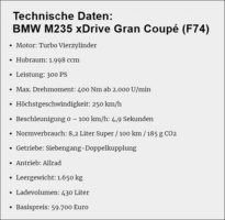 Das 2er Gran Coupé läuft bei BMW eigentlich unter dem großen Radar. Zu mächtig sind die 3er-, 4er- oder 5er-Baureihen, selbst die 1er sieht man im täglichen Straßenbild viel mehr. Doch vielleicht macht ja auch gerade das „Nischenmodell-Dasein“ für viele den besonderen Reiz des Coupés aus, das mit vier Endrohren, M-Niere, M-Spiegeln und -Heckspoiler, exklusiven M-19″-Leichtmetallrädern, M-Sportbremsanlage und M-Sportsitze eine äußerst sportliche Sprache spricht!